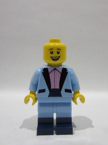 Bright Light Blue Torso Tuxedo Jacket with Silver Dots, Bright Pink Ruffled Shirt Pattern / Bright Light Blue Arms / Yellow Hands
