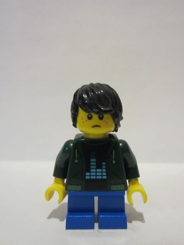 lego 2022 mini figurine bdp034 Boy Dark Green Hoodie with Bright Green Drawstrings, Blue Short Legs, Black Tousled Hair