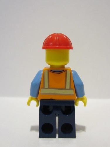 lego 2023 mini figurine bdp060 Construction Worker Male, Orange Safety Vest with Reflective Stripes, Dark Blue Legs, Red Construction Helmet, Smirk