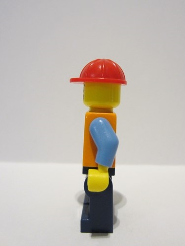 lego 2023 mini figurine bdp061 Construction Worker Male, Orange Safety Vest with Reflective Stripes, Dark Blue Legs, Red Construction Helmet, Large Grin