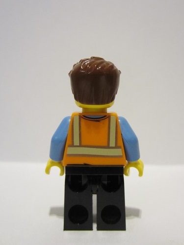 lego 2023 mini figurine bdp082 Train Driver Male, Orange Safety Vest with Reflective Stripes, Black Legs, Reddish Brown Hair