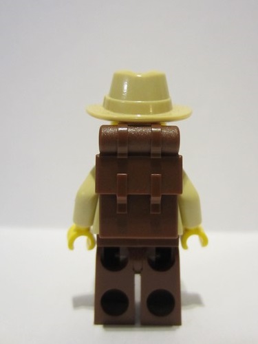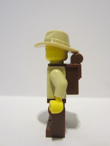 lego 2023 mini figurine bdp084 Traveler Male, Tan Shirt, Reddish Brown Legs, Reddish Brown Backpack, Tan Fedora Hat