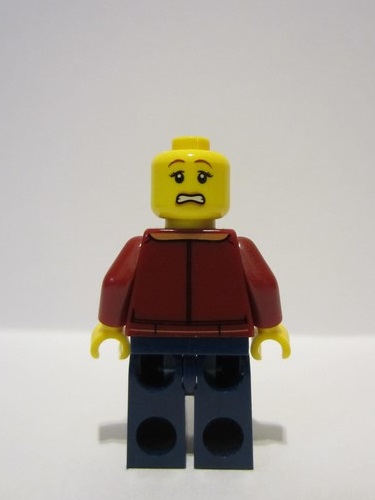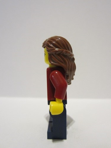 lego 2023 mini figurine bdp088 Traveler Female, Dark Red Jacket with Bright Light Blue Shirt, Dark Blue Legs, Reddish Brown Hair