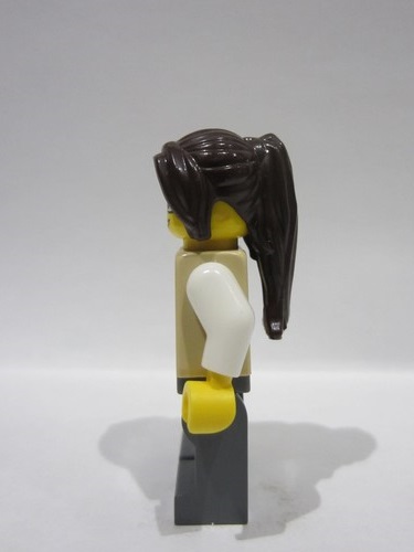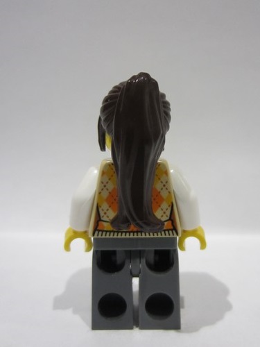 lego 2024 mini figurine bdp129 Ticket Vendor Female, Tan Knit Argyle Sweater Vest, Dark Bluish Gray Legs, Dark Brown Hair Ponytail Long with Side Bangs, Glasses
