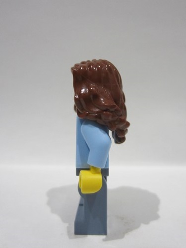 lego 2024 mini figurine bdp135 Passenger Female, Bright Light Blue Jacket over White Shirt with Coral Flowers, Sand Blue Legs, Reddish Brown Wavy Hair