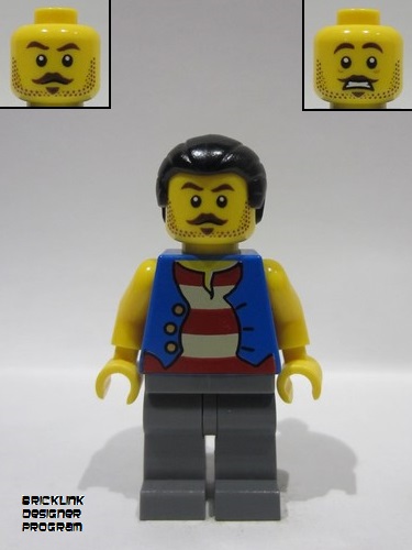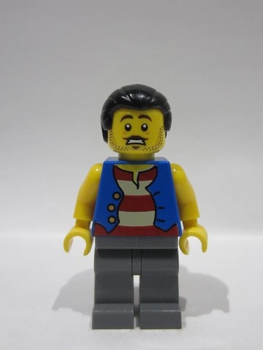 lego 2024 mini figurine bdp147 Pirate Male, Blue Vest, Dark Bluish Gray Legs, Black Hair with Short Ponytail
