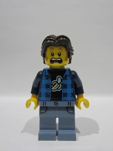 lego 2025 mini figurine bdp162 The Art of Chocolate Customer Male, Dark Azure Flannel Shirt, Dark Blue Banana T-Shirt, Sand Blue Legs, Dark Brown Short Wavy Hair