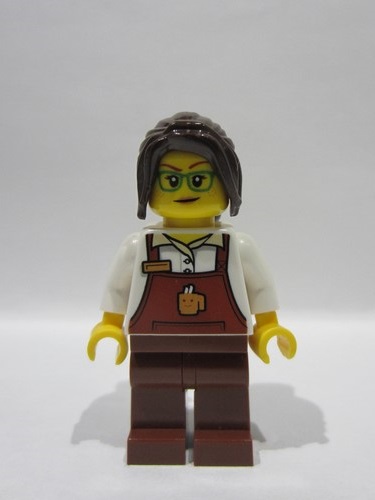 lego 2025 mini figurine bdp163 The Art of Chocolate Barista Female, Reddish Brown Apron with Cup and Name Tag, Reddish Brown Legs, Dark Brown Hair Ponytail Long