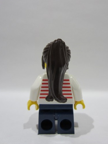 lego 2025 mini figurine bdp205 Merchant Boat - Girl White Sweater with Red Horizontal Stripes, Dark Blue Medium Legs, Dark Brown Hair Ponytail Long with Side Bangs, Freckles