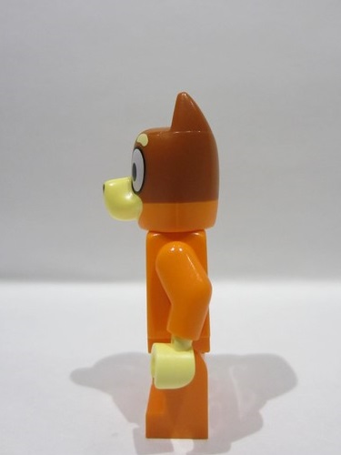 Orange Minifigure, Head, Modified Dog (Cattle) with Straight Ears, Hole on Top with Molded Dark Orange Top and Bright Light Yellow Muzzle and Auricles and Printed Eyes, Eyebrows, Markings and Dark Brown Nose Pattern