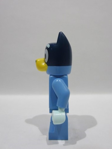 Medium Blue Minifigure, Head, Modified Dog (Cattle) with Straight Ears, Hole on Top with Molded Dark Blue Top and Yellow Muzzle and Auricles and Printed Eyes, Light Aqua Eyebrows, Medium Blue Markings, Black Nose Pattern