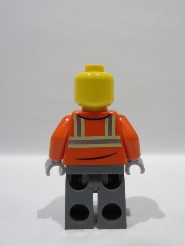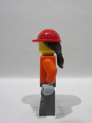 lego 2026 mini figurine cty1972 Construction Worker Female, Reddish Orange Safety Jacket with Reflective Stripes, Dark Bluish Gray Legs, Red Construction Helmet with Dark Brown Ponytail Hair, Open Mouth Smile with Top Teeth