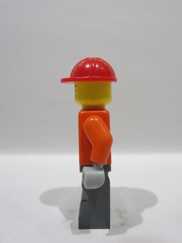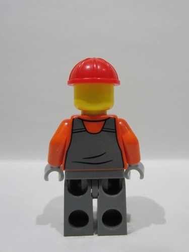 lego 2026 mini figurine cty1998 Construction Worker Male, Dark Bluish Gray Overalls over Reddish Orange Safety Jacket with Reflective Stripes, Dark Bluish Gray Legs, Red Construction Helmet, Lopsided Grin and Scuff
