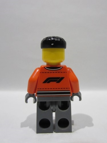 lego 2026 mini figurine cty2001 Formula 1 Pit Crew Member Male, Reddish Orange Racing Suit with Pockets, Dark Bluish Gray Legs, Black Hair, Scuff Mark