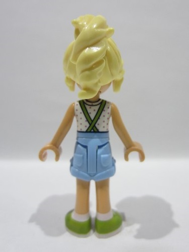 Medium Tan Torso Mini Doll Girl Bright Light Blue Overalls with Black Pocket and Lime Straps over White Shirt with Magenta Dots Pattern, Medium Tan Arms with Hands