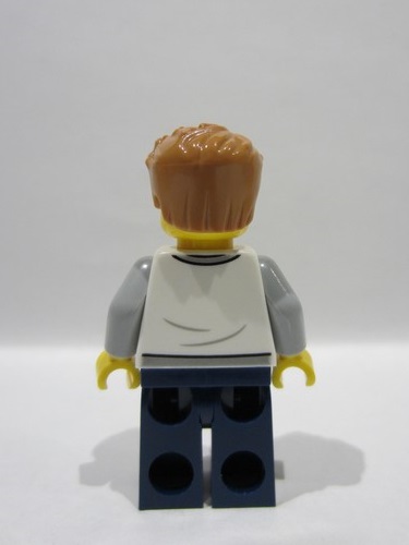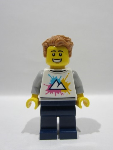 lego 2025 mini figurine idea240 Tourist White Shirt with Mountains Logo, Dark Blue Legs, Medium Nougat Tousled Hair