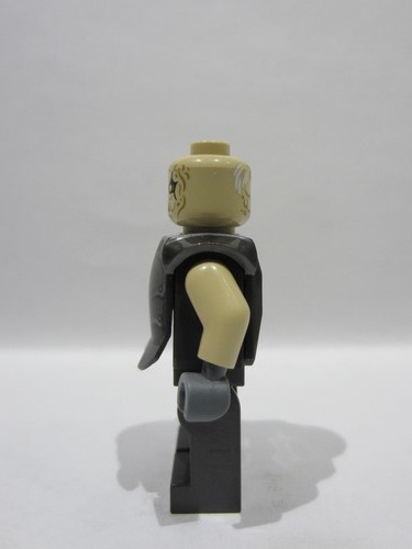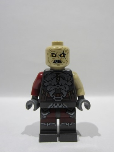 Tan Minifigure, Head Alien Orc Bright Light Orange Eyes, Dark Tan Wrinkles and Scars, Angry Open Mouth with Teeth, White Thin Hair on Back Pattern