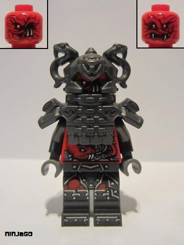 Red Torso Ninjago Metallic Silver Armor with 2 Large Red Snakes with White Fangs and Clock Pattern / Pearl Dark Gray Arms / Dark Bluish Gray Hands