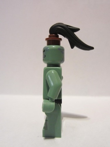 Sand Green Minifigure, Head Alien with Black Bushy Eyebrows, Yellow Eyes, White Lower Fangs, and Sand Blue Scales Pattern