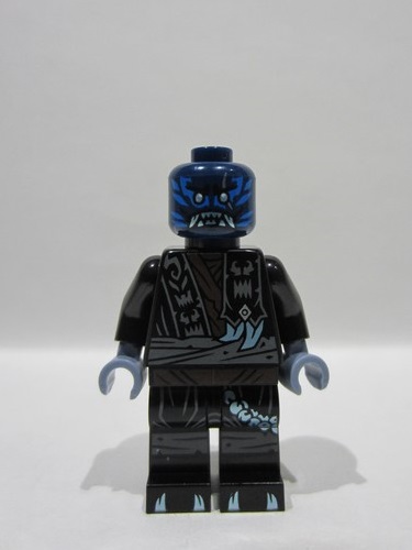 Dark Blue Minifigure, Head Alien with Black Eyebrows, Metallic Light Blue Eyes and Scar, Blue Markings, Angry Open Mouth with Fangs and Sharp Teeth Parted Pattern