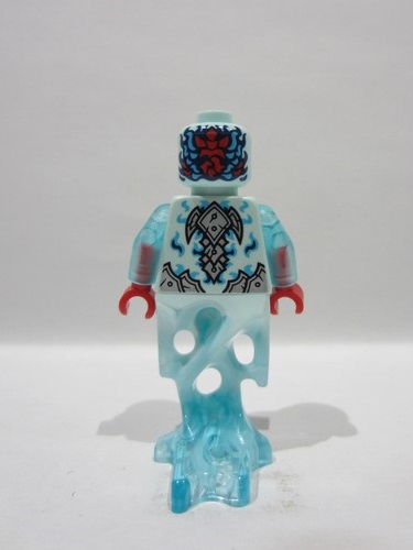 Light Aqua Minifigure, Head Alien Dragon with Medium Azure Face, Red Eyes, Dark Blue Eyebrows and Nostrils, Open Mouth with Fangs and Sharp Teeth, Scales and Swirls on Back Pattern