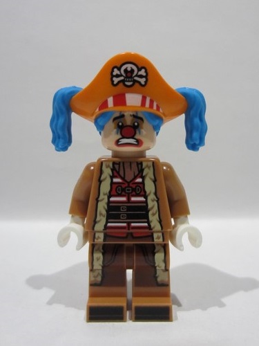 Light Nougat Minifigure, Head Dual Sided Clown Black Eyebrows, Medium Nougat Eye Shadow, Dark Azure Vertical Lines, White Crossbones, Red Nose and Lips, Open Mouth with Teeth Smile / Sad Pattern
