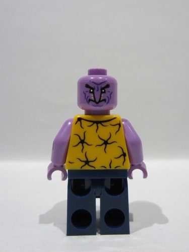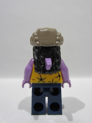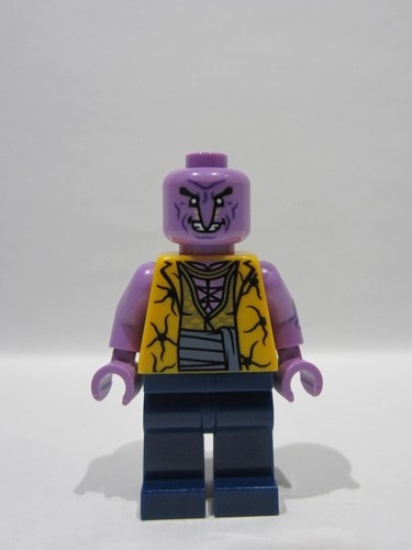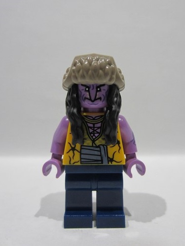 Medium Lavender Minifigure, Head Dual Side Alien, Black Eyebrows, Dark Purple Contour Lines, Long Nose, Tan Stripes, Neutral / Smile with Teeth Pattern