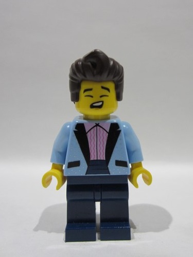 Bright Light Blue Torso Tuxedo Jacket with Silver Dots, Bright Pink Ruffled Shirt Pattern / Bright Light Blue Arms / Yellow Hands
