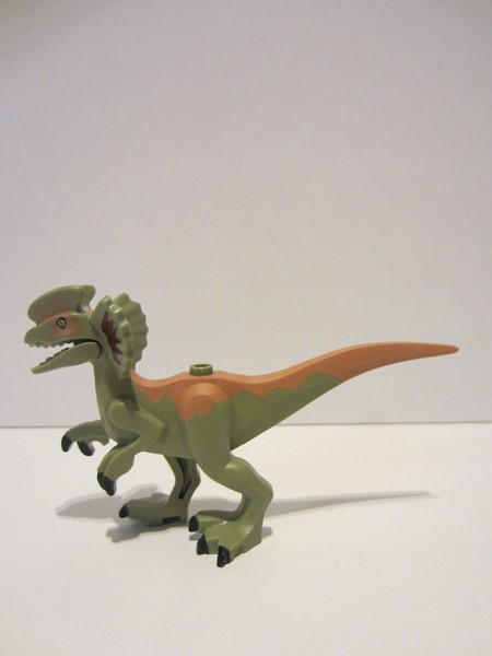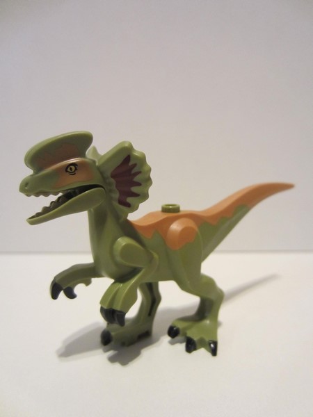 lego 2019 animal dilo03 Dilophosaurus Olive Green, Second Version with Flexible Rubber Tail, Dark Red and Medium Nougat Markings Pattern