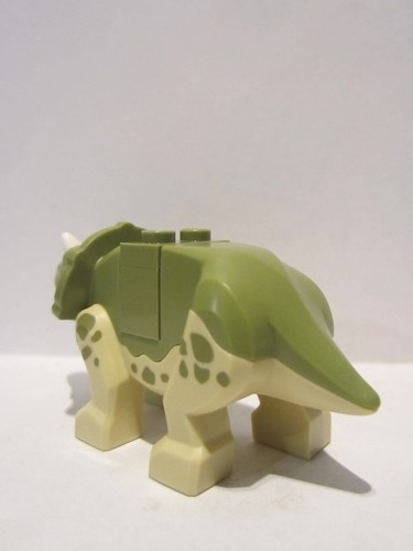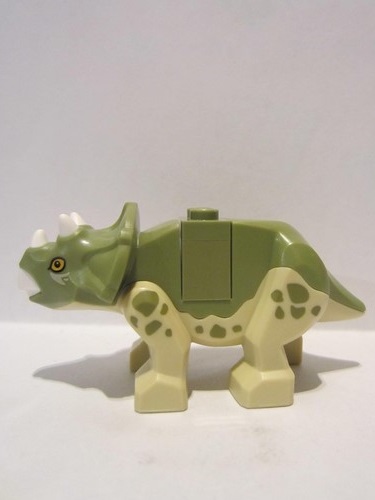 Tan Dinosaur Triceratops Baby with Fixed Olive Green Top with Molded White Horns and Beak and Printed Bright Light Orange Eyes and Olive Green Spots Pattern