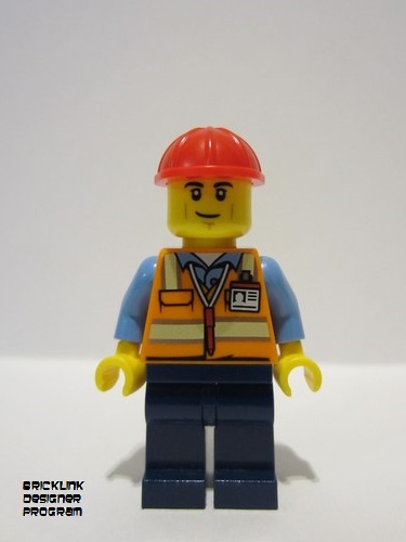 lego 2023 mini figurine bdp060 Construction Worker Male, Orange Safety Vest with Reflective Stripes, Dark Blue Legs, Red Construction Helmet, Smirk