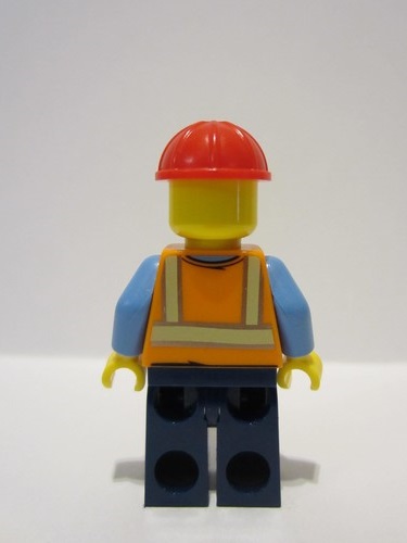 lego 2023 mini figurine bdp061 Construction Worker Male, Orange Safety Vest with Reflective Stripes, Dark Blue Legs, Red Construction Helmet, Large Grin