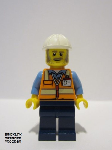 lego 2023 mini figurine bdp063 Construction Foreman Male, Orange Safety Vest with Reflective Stripes, Dark Blue Legs, White Construction Helmet