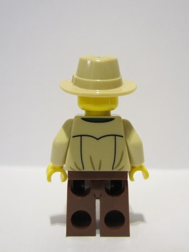 lego 2023 mini figurine bdp084 Traveler Male, Tan Shirt, Reddish Brown Legs, Reddish Brown Backpack, Tan Fedora Hat