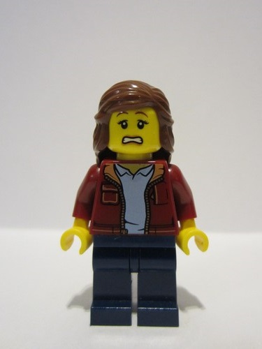 lego 2023 mini figurine bdp088 Traveler Female, Dark Red Jacket with Bright Light Blue Shirt, Dark Blue Legs, Reddish Brown Hair
