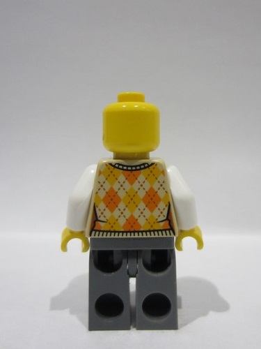 lego 2024 mini figurine bdp129 Ticket Vendor Female, Tan Knit Argyle Sweater Vest, Dark Bluish Gray Legs, Dark Brown Hair Ponytail Long with Side Bangs, Glasses