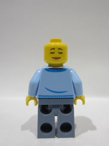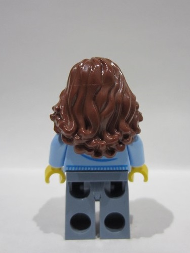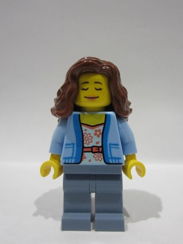 lego 2024 mini figurine bdp135 Passenger Female, Bright Light Blue Jacket over White Shirt with Coral Flowers, Sand Blue Legs, Reddish Brown Wavy Hair