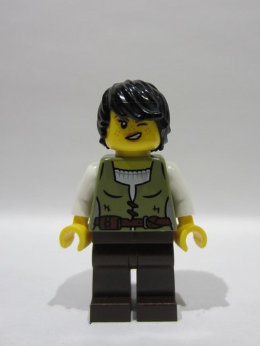 lego 2025 mini figurine bdp181 Medieval Seaside Market Snake Charmer Female, Vest over White Shirt, Dark Brown Legs, Black Hair