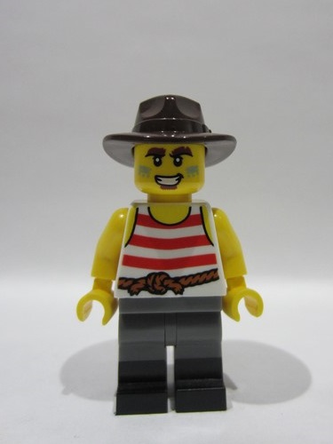 lego 2025 mini figurine bdp194 Wild West Train Bandit Male, White Tank Top with Red Stripes, Dark Bluish Gray Legs with Black Boots, Dark Azure Bandana, Dark Brown Fedora