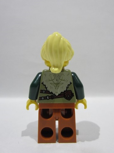 Olive Green Torso Viking Tunic with Tan Collar, Reddish Brown Belts and Pouches, Silver Buttons, Deer Head on Back Pattern / Dark Green Arms / Yellow Hands