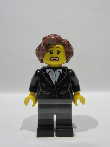 lego 2025 mini figurine bdp234 Vampire Castle Visitor Female, Black Suit Jacket with White Button Up Shirt, Dark Bluish Gray Legs with Black Boots, Reddish Brown Hair
