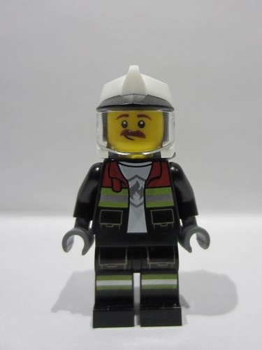 lego 2026 mini figurine cty1948 Fire Male, Black Open Jacket and Legs with Reflective Stripes and Red Collar, White Fire Helmet, Trans-Clear Visor, Reddish Brown Moustache