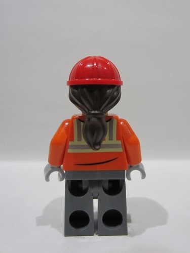 lego 2026 mini figurine cty1972 Construction Worker Female, Reddish Orange Safety Jacket with Reflective Stripes, Dark Bluish Gray Legs, Red Construction Helmet with Dark Brown Ponytail Hair, Open Mouth Smile with Top Teeth