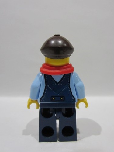 Dark Blue Overalls, Dark Brown Flat Cap, Red Scarf