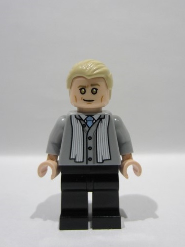 Light Bluish Gray Torso Cardigan Sweater with Black Buttons, Striped Scarf, White Shirt, Bright Light Blue Tie Pattern / Light Bluish Gray Arms / Light Nougat Hands