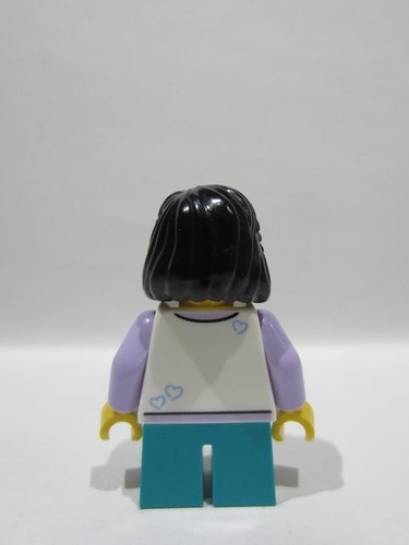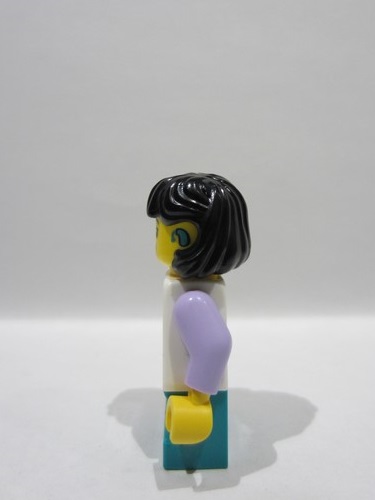 lego 2025 mini figurine idea243 Child Girl, White Top with Raccoon, Dark Turquoise Short Legs, Black Midlength Hair, Hearing Aid