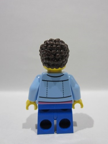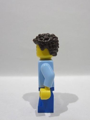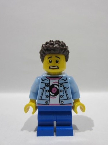 lego 2025 mini figurine idea244 Child Boy, Grandson, Bright Light Blue Denim Jacket over Shirt with Record, Blue Medium Legs, Dark Brown Coiled Short Hair