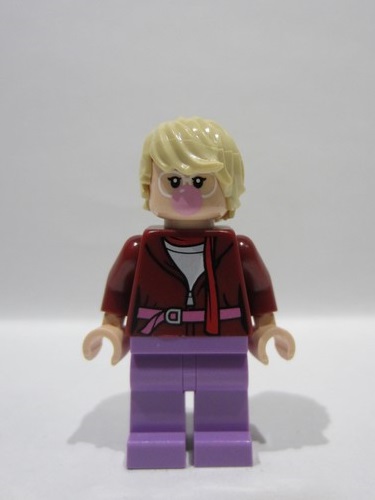 Light Nougat Minifigure, Head Dual Sided Female Dark Tan Eyebrows, White Round Glasses, Nougat Lips and Chin Dimple, Lopsided Grin / Blowing Bright Pink Bubblegum Bubble Pattern