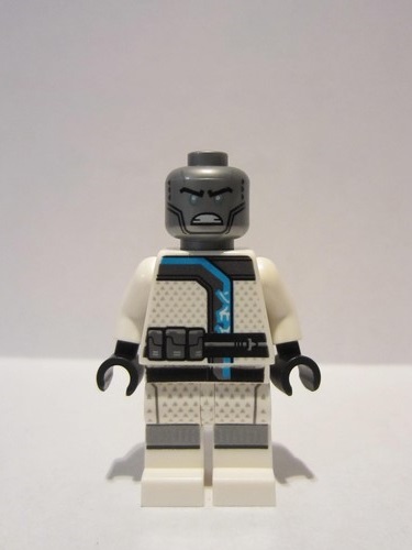Flat Silver Minifigure, Head Alien Robot with Black Eyebrows, Metallic Light Blue Eyes, Cheek Lines, Angry Bared Teeth, Vents and Silver Circle on Back Pattern