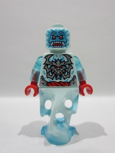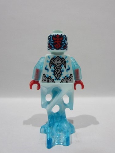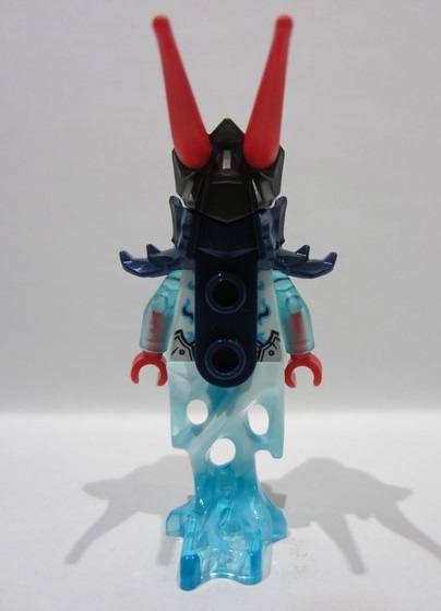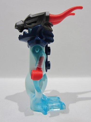 Light Aqua Minifigure, Head Alien Dragon with Medium Azure Face, Red Eyes, Dark Blue Eyebrows and Nostrils, Open Mouth with Fangs and Sharp Teeth, Scales and Swirls on Back Pattern